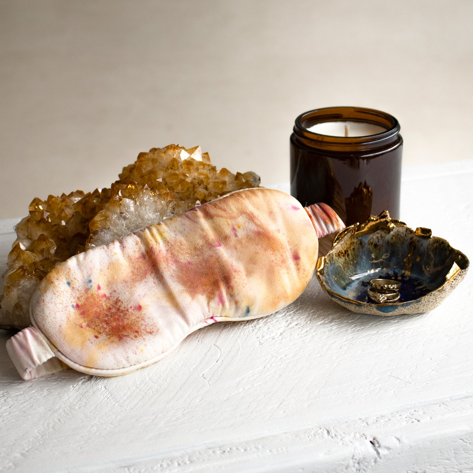 100% silk eye masks hand-dyed by us. Helps prevent dry eyes and cooling the face while “dark sleeping” in general increases melatonin and time in the REM cycle helping you sleep deeply through the night.