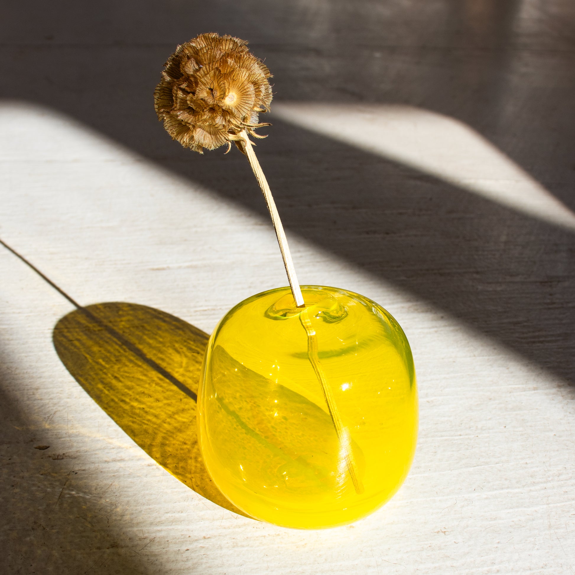 Little gem glass vases are handblown by Gary Bodker in his Portland, Oregon shop and catch light to pop with color. 3 x 3 inches. Hand-washing recommended.